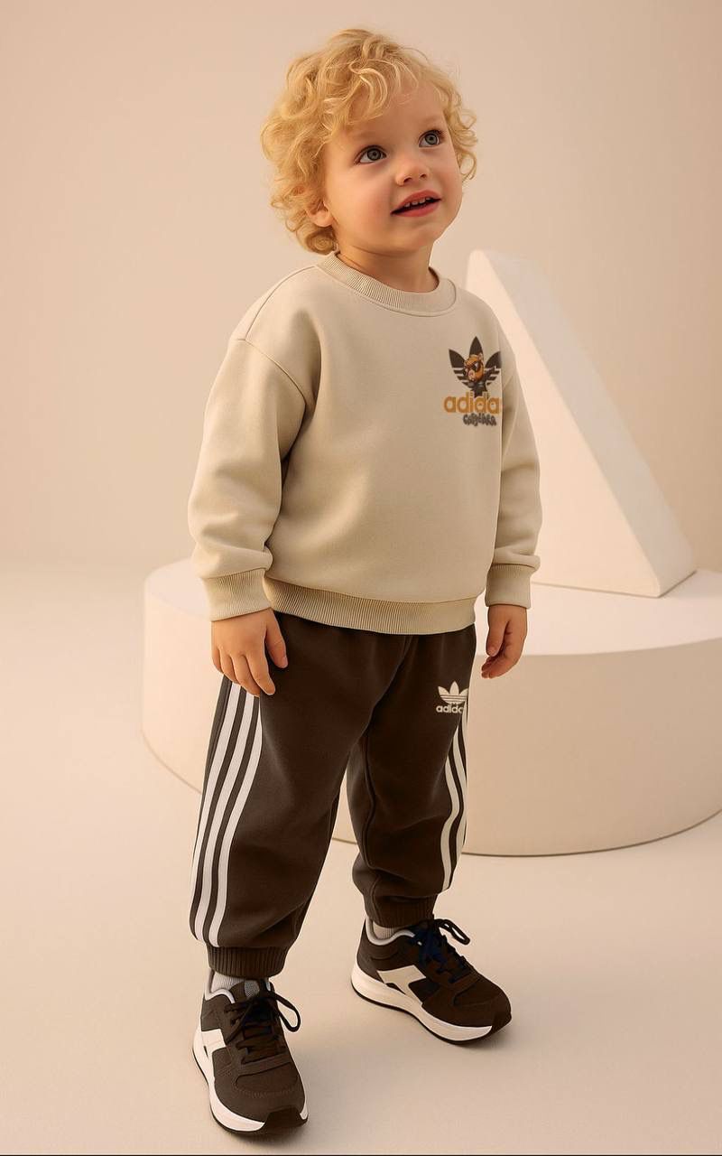 Alt (Kahve Eşofman Altı): Bej sweatshirt ile kontrast oluşturan koyu griye yakın kahve tonundaki eşofman altı, yanlarındaki klasik spor şerit detaylarıyla modern bir görünüm sunuyor. Esnek yapısıyla hareket özgürlüğü sağlarken, konforlu kesimi sayesinde miniklerin tüm gün rahat etmesini garanti eder.