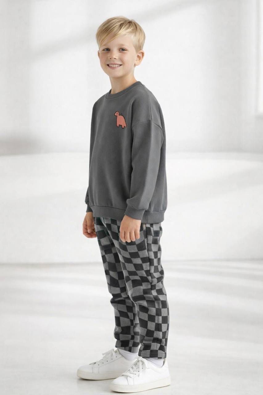 Pantolon Tasarımı: Modern ve dinamik bir görünüm sunan, antrasit-gri renklerde damalı (checkerboard) desenli eşofman altı.