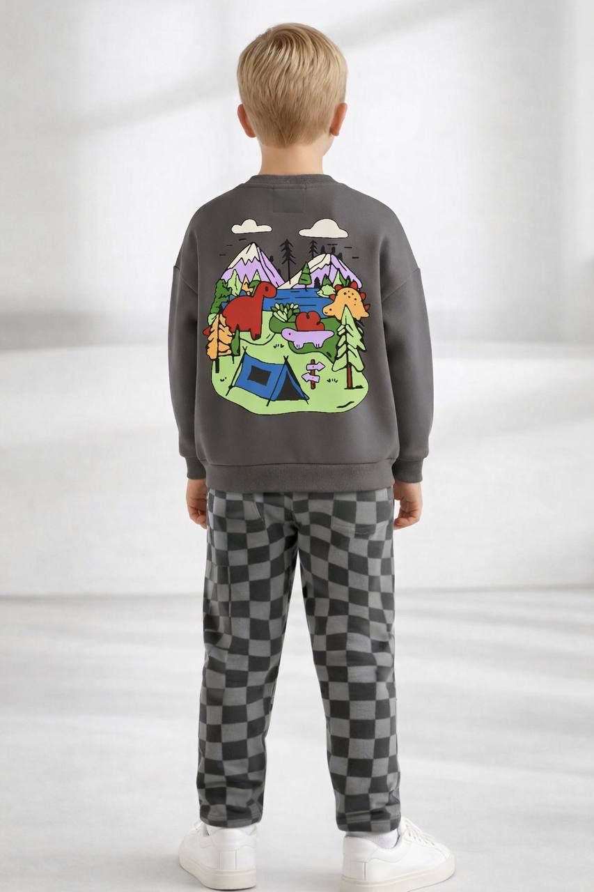 Üst Sweatshirt: Ön kısmında sevimli bir dinozor figürü, arka kısmında ise tüm sırtı kaplayan, renkli ve yüksek kaliteli "Dinozor Kampı" illüstrasyonu yer alır.
