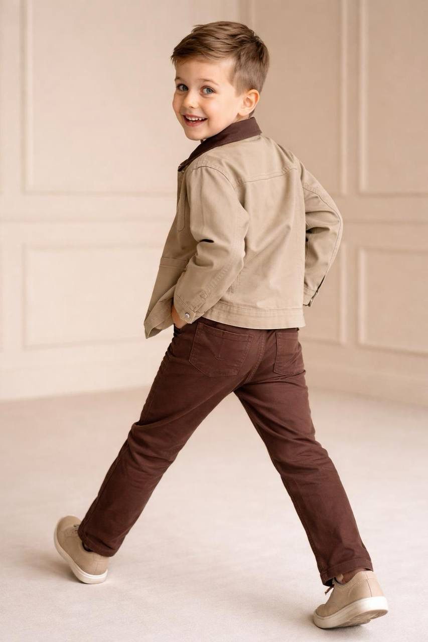 Pantolon Konforu: Koyu kahverengi pantolon, ayarlanabilir bel ipi sayesinde çocuğunuzun beline tam oturur ve gün boyu düşme yapmaz.