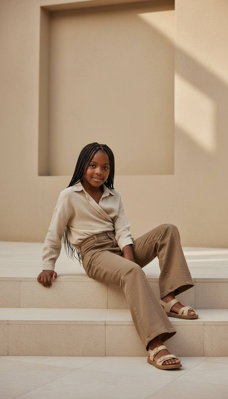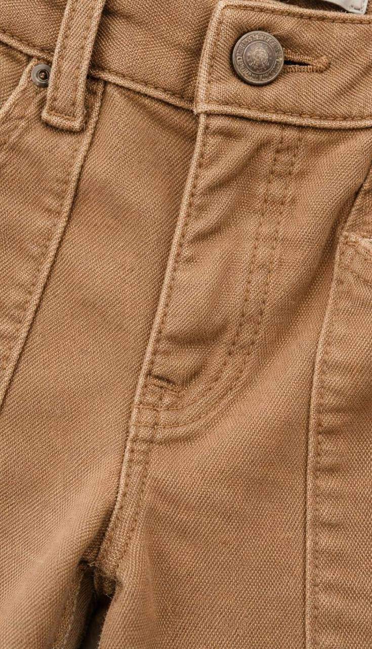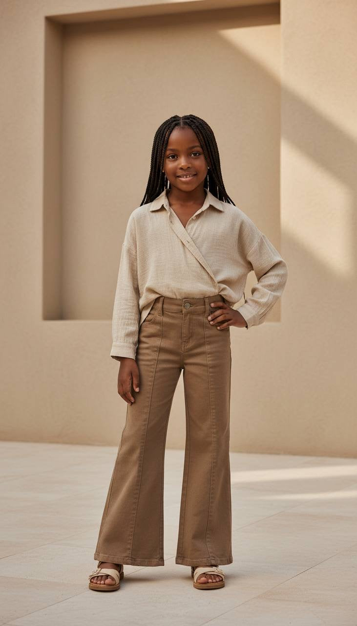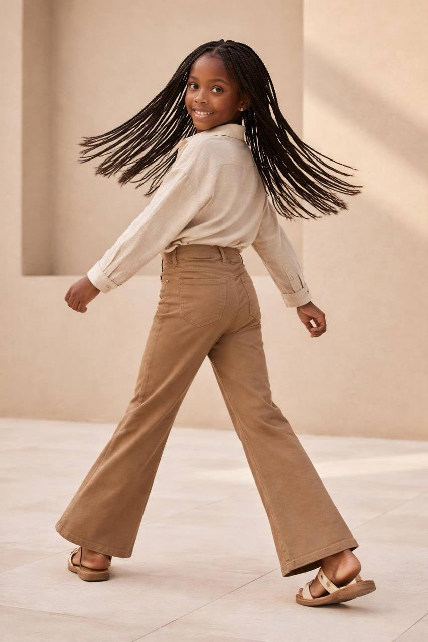 Klasik ve modern stilin mükemmel uyumu! Little Bee Baby kalitesiyle tasarlanan bu bej kanvas pantolon, minik hanımların gardırobuna hem şıklık hem de konfor getiriyor. İspanyol paça (flare) kesimiyle retro bir hava sunan bu parça, her mevsim kombinlerin yıldızı olacak.
