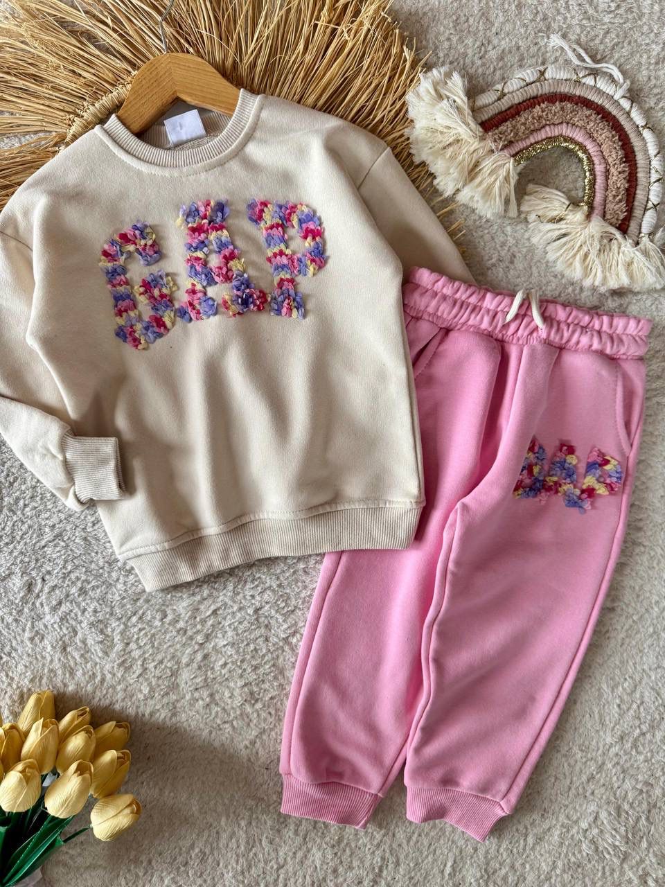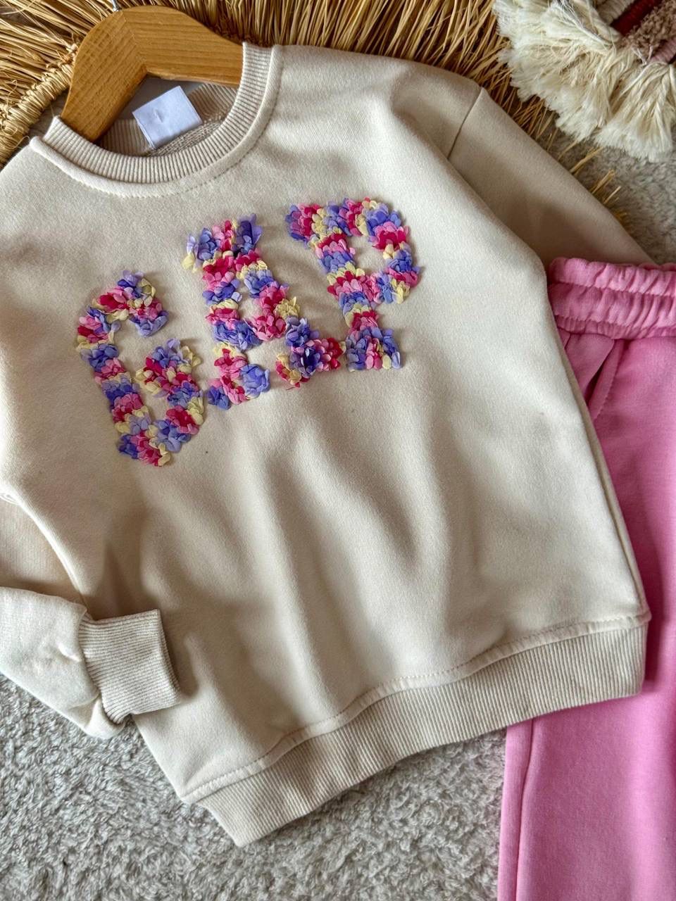 Canlı Çiçek İşlemesi: Krem rengi sweatshirt üzerindeki GAP yazısı, rengarenk minik çiçek desenleriyle işlenmiştir. Bu detay, takıma benzersiz ve neşeli bir hava katmaktadır.