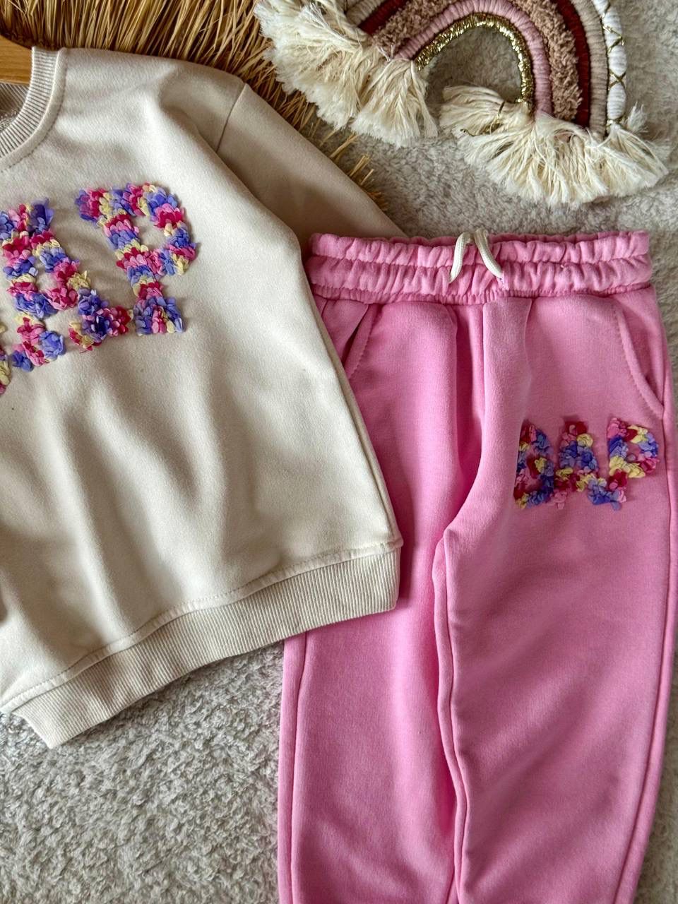 Zarif Pembe Alt: Alt eşofmanın canlı pembe rengi, üst kısımdaki çiçek detaylarının cebinde de minik bir nakışla tekrar edilmesiyle takımın bütünlüğünü tamamlar.