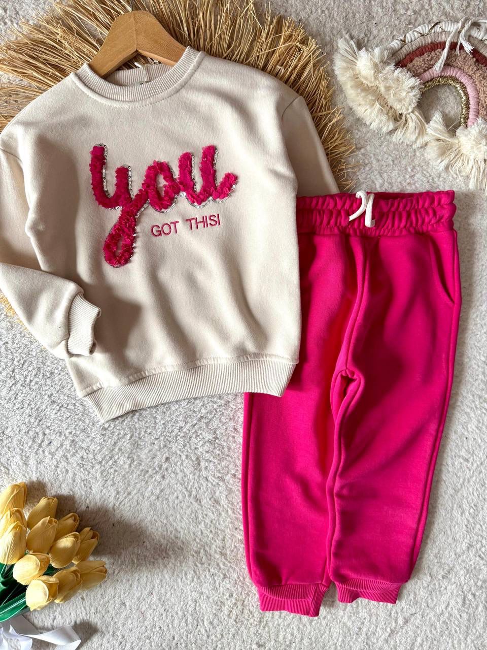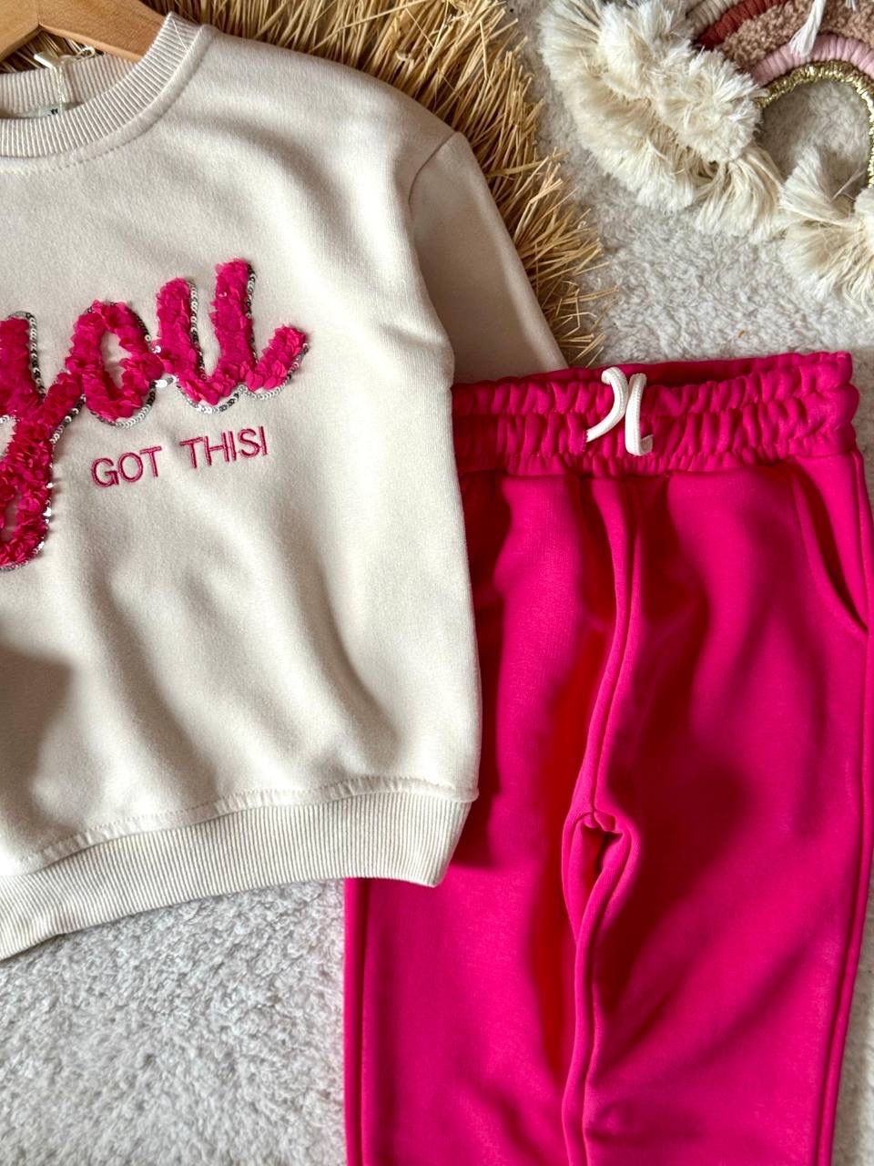 Tasarım Detayları: Üst sweatshirt üzerinde yükseltilmiş dokulu, parlak pembe "You" yazısı ve altında "Got This" motivasyon mesajı yer alır.